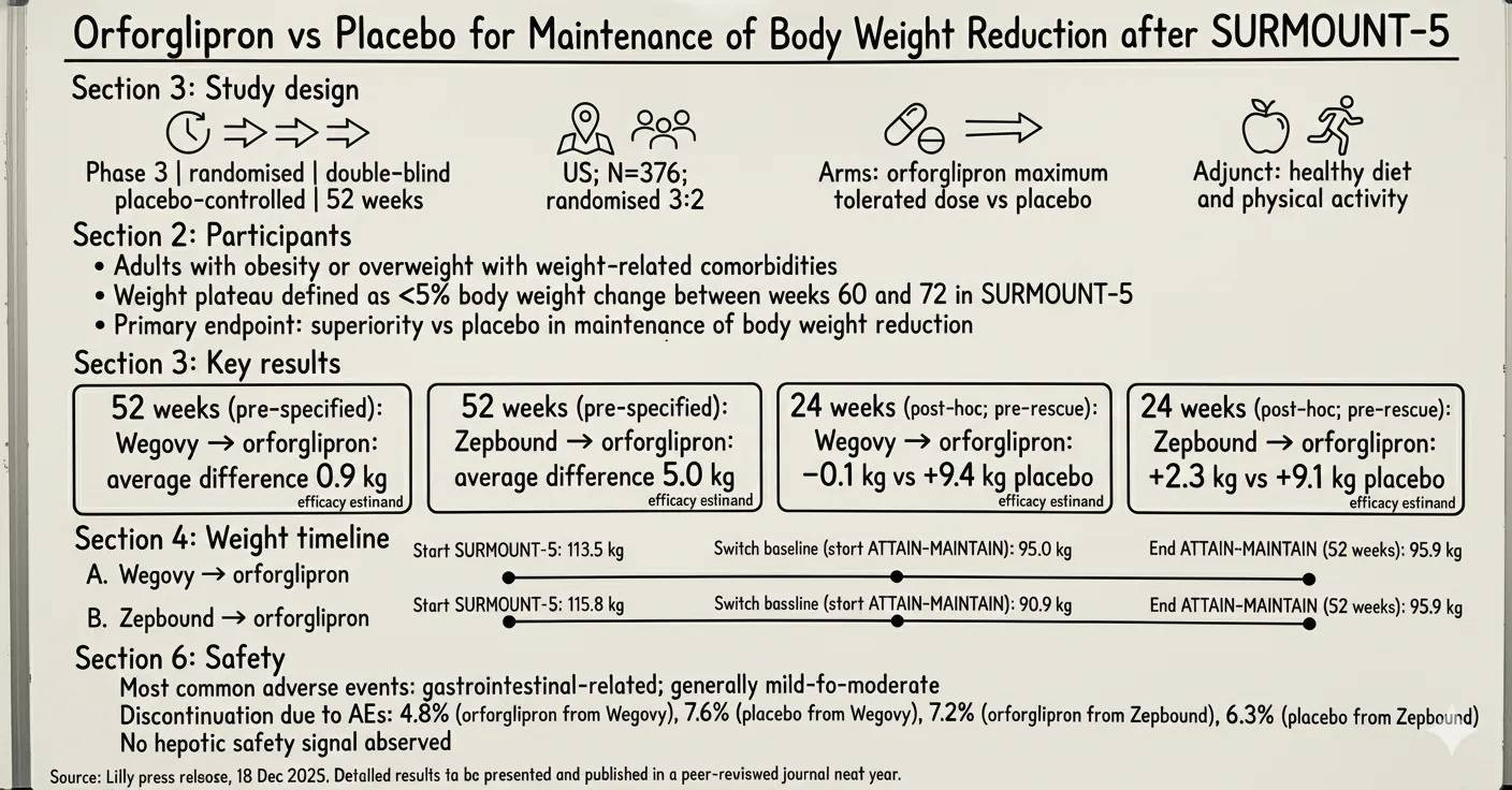 Eli Lilly has reported positive topline Phase 3 results from ATTAIN-MAINTAIN, a trial designed to answer a very practical question: after achieving weight loss on injectable therapies, can patients maintain that loss by switching to a once-daily oral GLP-1?